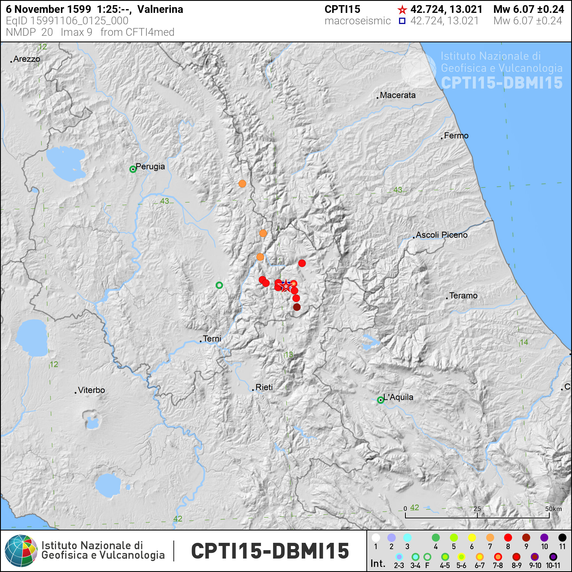 Il terremoto fu sentito in una vasta area dell’Italia centrale: da Pesaro a Roma. Varie repliche furono sentite fino alla metà di gennaio 1600.