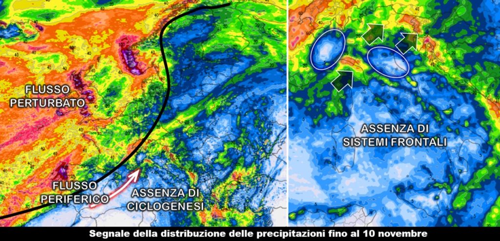 A corredo dell’articolo pubblicato ieri, ecco la proiezione del segnale piovoso calcolato dalla modellistica numerica e valido per i prossimi dieci giorni, fino alla fine della prima decade di novembre. Non è una previsione da intendere in senso stretto per ovvi motivi legati alla predicibilità dell’atmosfera, ma è un modo per cogliere meglio l’assenza di una dinamica autunnale degna di tale nome sul bacino del Mediterraneo. Lungo quella linea nera scorre all’incirca il confine entro il quale si estende il raggio d’azione del flusso perturbato atlantico mentre al di sotto di essa la circolazione periferica, che fa da cerniera con le correnti a componente anticiclonica presenti più a sud, trasporta solo aria umida che rilascia precipitazioni più organizzate solo laddove il flusso interagisce con l’orografia della nostra penisola.