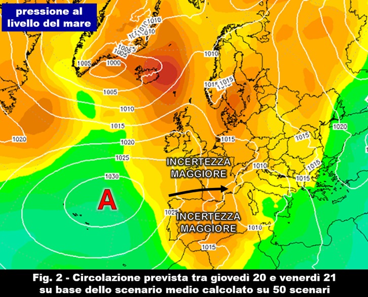 Per permettere l’ulteriore avanzamento delle correnti verso sud, fino a entrare sul Mediterraneo, è necessaria la formazione di un altro ingranaggio ciclonico alle nostre latitudini: sebbene le ipotesi di ciclogenesi inizino a farsi strada nei vari scenari calcolati dalla modellistica numerica per il periodo compreso tra giovedì e venerdì prossimi (20 e 21 novembre), vista la distanza temporale ci troviamo ancora in una fase di scarsa attendibilità circa la posizione che potrebbe assumere il centro di bassa pressione e circa la sua intensità, cioè quanto potrebbe essere profondo. È ovvio supporre che una parte di questa aria fredda riuscirà a raggiungerci, ma l’entità del raffreddamento a cui potremmo andare incontro nella seconda parte della prossima settimana dipenderà proprio dalle caratteristiche del possibile minimo mediterraneo, nonché dalla risposta del campo anticiclonico delle Azzorre a questa irruzione. Si sa infatti che l’aria fredda è più pesante di quella calda e di conseguenza il suo arrivo determina, nei bassi strati, un aumento della pressione atmosferica che dai calcoli della modellistica numerica è ben apprezzabile dalla parziale espansione del campo anticiclonico atlantico verso levante (fig. 2): anche in questo caso, non è ancora ben chiara l’entità di questa spinta e quindi quanto il minimo depressionario potrebbe essere incalzato da ovest da un aumento della pressione atmosferica.