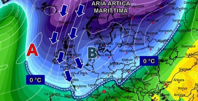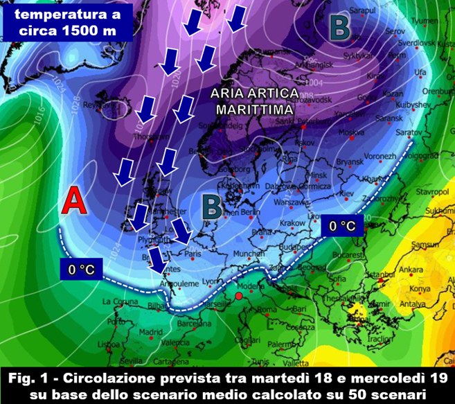 L’azione congiunta tra l’Anticiclone delle Azzorre e la saccatura artica permetterebbe al flusso di aria fredda di spingersi verso latitudini europee più meridionali grazie a quel meccanismo a ingranaggi necessario per dare all’aria fredda la spinta necessaria per spostarsi sempre più a sud. In questo caso, la traiettoria delle correnti settentrionali sarebbe decisa da un minimo secondario che potrebbe collocarsi sul Mare del Nord e guidare così il fronte avanzante della massa di aria fredda fin sulla Francia ed il versante estero delle Alpi, come indicato dalla posizione dell’isoterma di 0 °C a circa 1500 metri di quota (fig. 1).
