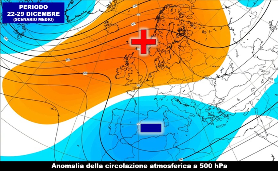 Abbiamo iniziato a parlare del cambiamento di scenario che potrebbe verificarsi durante la settimana di Natale: pur trattandosi come detto di una linea di tendenza a lungo termine, nell’articolo pubblicato due giorni fa è stato possibile accennare in modo molto generico al segnale dominante emergente dai calcoli nella modellistica numerica perché gli scenari convergevano in due cluster piuttosto simili, in cui si intravedeva la possibile formazione di una struttura anticiclonica alle alte latitudini europee contrapposta ad una zona depressionaria in sede mediterranea.