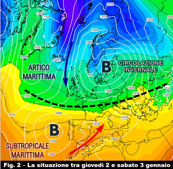 Resteremo così ai margini della circolazione di stampo prettamente invernale, caratterizzata da isoterme a circa 1500 metri comprese tra -10 e -15 °C, che avvolgerà in una ragnatela di isobare l’area balcanica e il settore centro-orientale europeo ma che, con l’avvio del nuovo anno, sposterà il proprio equilibrio più a ovest a causa dell’inserimento di un nuovo vortice in arrivo e in approfondimento dalla costa orientale groenlandese verso il Mare del Nord. Il quadro sinottico previsto per l’inizio del nuovo anno, tra giovedì 2 e venerdì 3, rimodulerà così la vasta circolazione invernale spostando il centro motore di bassa pressione dalla Russia occidentale alla penisola scandinava e mantenendo così attivo il flusso di aria artico-marittima (fig. 2). La nostra penisola si troverà comunque sempre ai margini di questo sistema, con l’aria fredda destinata per il momento a rimanere al di là dell’arco alpino e, per quanto riguarda un suo eventuale spostamento ancora più a sud, appesa all’evoluzione di una nuova struttura ciclonica in avvicinamento dalle basse latitudini atlantiche e in probabile ingresso sul Mediterraneo occidentale.