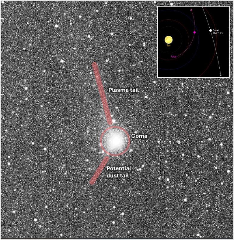 Non solo vediamo chiaramente l’alone luminoso di gas che circonda la cometa, noto come chioma, ma vediamo anche un accenno di due code. La “coda di plasma” della cometa, composta da gas elettricamente carico, si estende verso la parte superiore dell’immagine. Potremmo anche vedere una “coda di polvere” più debole, composta da minuscole particelle solide, che si estende verso l’angolo in basso a sinistra dell’immagine. L’immagine è stata scattata il 2 novembre 2025, durante il primo periodo di osservazione di Juice su 3I/ATLAS. Due giorni prima del massimo avvicinamento di Juice alla cometa, avvenuto il 4 novembre a una distanza di circa 66 milioni di km.Ci aspettiamo di ricevere i dati dai cinque strumenti scientifici accesi durante le osservazioni – JANUS, MAJIS, UVS, SWI e PEP – il 18 e il 20 febbraio 2026.