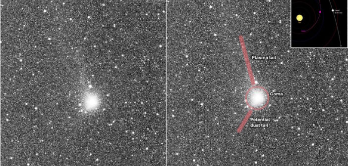 Non solo vediamo chiaramente l’alone luminoso di gas che circonda la cometa, noto come chioma, ma vediamo anche un accenno di due code. La “coda di plasma” della cometa, composta da gas elettricamente carico, si estende verso la parte superiore dell’immagine. Potremmo anche vedere una “coda di polvere” più debole, composta da minuscole particelle solide, che si estende verso l’angolo in basso a sinistra dell’immagine. L’immagine è stata scattata il 2 novembre 2025, durante il primo periodo di osservazione di Juice su 3I/ATLAS. Due giorni prima del massimo avvicinamento di Juice alla cometa, avvenuto il 4 novembre a una distanza di circa 66 milioni di km.Ci aspettiamo di ricevere i dati dai cinque strumenti scientifici accesi durante le osservazioni – JANUS, MAJIS, UVS, SWI e PEP – il 18 e il 20 febbraio 2026.