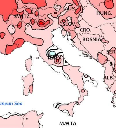 E oggi andiamo a mostrarvi un qualcosa di davvero singolare e unico, che crediamo sia quasi impossibile da ripetersi, perchè l’analisi della anomalia delle temperature in Europa, realizzato dalla NOAA, nel periodo che va dal 6 al 13 dicembre 2025, ha rilevato una unica zona sotto media di tutto il territorio europeo, intorno ai 3 gradi al di sotto della norma, che rappresenta praticamente l’Umbria, nella sua interezza (anche se noi sappiamo che riguarda le zone pianeggianti di questa regione).