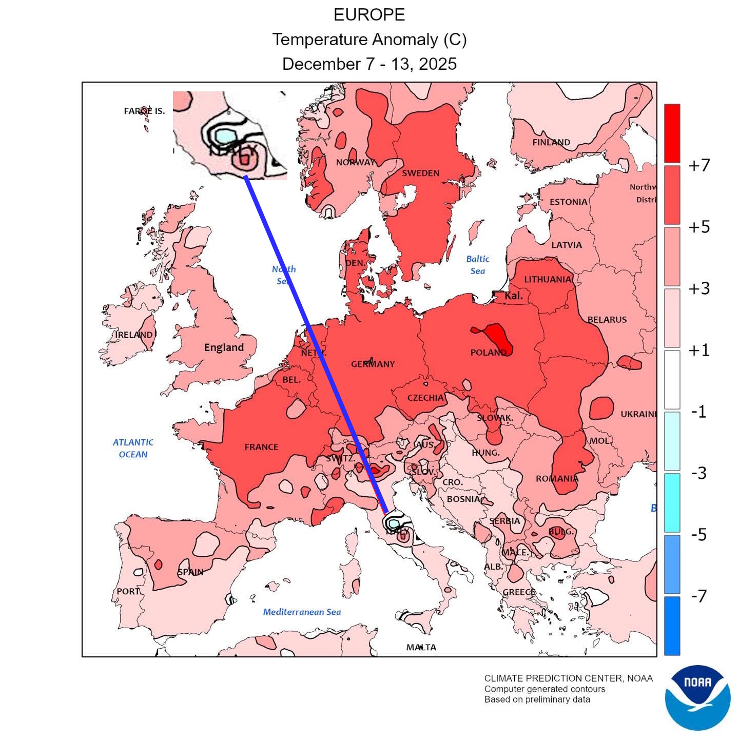 E oggi andiamo a mostrarvi un qualcosa di davvero singolare e unico, che crediamo sia quasi impossibile da ripetersi, perchè l’analisi della anomalia delle temperature in Europa, realizzato dalla NOAA, nel periodo che va dal 6 al 13 dicembre 2025, ha rilevato una unica zona sotto media di tutto il territorio europeo, intorno ai 3 gradi al di sotto della norma, che rappresenta praticamente l’Umbria, nella sua interezza (anche se noi sappiamo che riguarda le zone pianeggianti di questa regione).