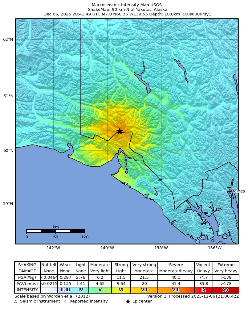 Epicentro nella zona a nord di Yakutat, per fortuna in una zona non densamente popolata. Si temono comunque danni a cose e persone.