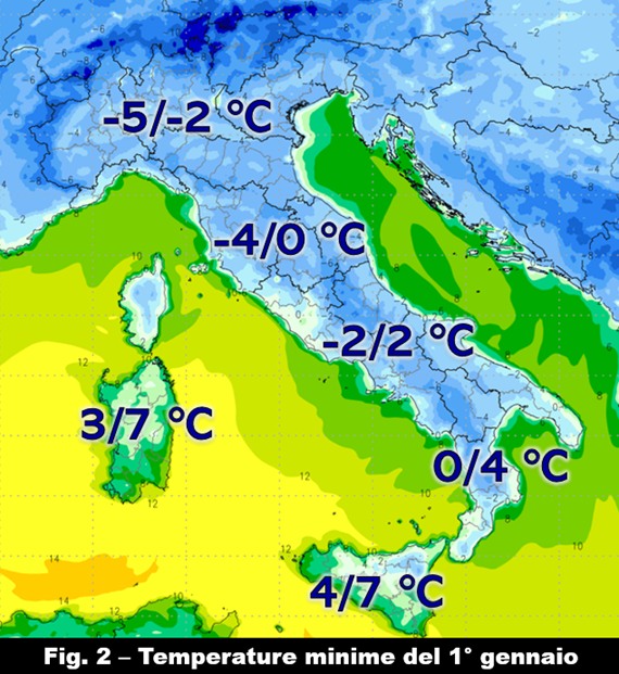 Il sensibile calo termico si avvertirà soprattutto mercoledì 31: al Nord le temperature massime non supereranno i 4-5 °C (qualche grado in più sulle coste liguri), mentre sulle regioni centro-meridionali peninsulari i valori saranno per lo più compresi tra 6 e 11 °C, più bassi lungo il versante adriatico. Con l’attenuazione della ventilazione, prevista proprio dal pomeriggio di mercoledì soprattutto al Centro-Nord, la perdita di calore verso lo spazio in condizioni di cielo sereno e aria secca si amplificherà notevolmente e darà i massimi effetti proprio nella notte di Capodanno, quando sono attese diffuse gelate specie sulle regioni centro-settentrionali: le temperature minime del 1° gennaio si porteranno probabilmente intorno ai -5/-2 °C al Nord (ad eccezione delle coste liguri dove non si scenderà sotto 0 °C se non localmente) e -4/0 °C al Centro ma non sono tuttavia da escludere picchi inferiori in aperta campagna. Freddo a tratti intenso anche al Sud, dove però i valori saranno più elevati e fino a 3-4 °C. Relativamente più mite su Sicilia e Sardegna.
