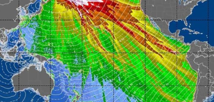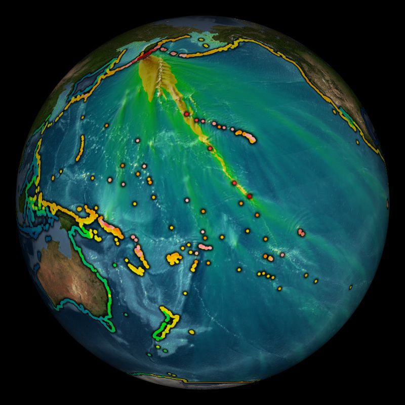 Il Pacific Tsunami Warning Center (PTWC) crea animazioni di tsunami con lo stesso strumento che utilizza per determinare la pericolosità degli tsunami in tempo reale: il modello di previsione Real-Time Forecasting of Tsunamis (RIFT). Il modello RIFT prende in input le informazioni sui terremoti e calcola il movimento delle onde attraverso gli oceani, prevedendone velocità, lunghezza d’onda e ampiezza. Questa animazione mostra i valori suddetti attraverso il moto simulato delle onde mentre attraversano l’Oceano Pacifico. È possibile vedere la distanza tra le creste delle onde successive (lunghezza d’onda) e il colore indica la loro altezza (metà ampiezza). Casa ancora più importante, il modello mostra cosa succede quando queste onde di tsunami colpiscono la terraferma.