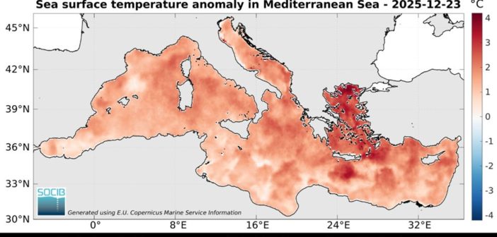 Paghiamo la persistenza di uno stato atmosferico che rimane vestito di autunno e che quindi porta con sé quelle condizioni meteorologiche che sono ancora tipiche della stagione passata: le precipitazioni abbondanti già registrate e quelle attese per esempio anche tra oggi e domani su alcune delle nostre regioni ne sono l’espressione più lampante. In effetti, siamo interessati da una vasta circolazione ciclonica che si è insediata sul Mediterraneo e che quindi produce nubi e precipitazioni. Nel circolo, però, entra anche parte del calore sottratto a una superficie marina che su tutto il bacino continua a mantenere una temperatura superiore alla media di 1-2 °C rispetto alla climatologia dell’ultimo trentennio (fig. 1).