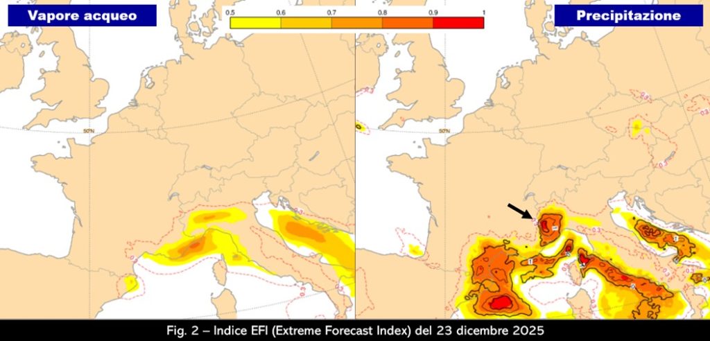 Di conseguenza, aumentano anche i flussi di vapore acqueo che la medesima struttura ciclonica mette in movimento fino a quando questi non intercettano una barriera montuosa e si trasformano in precipitazioni che risultano abbondanti proprio perché è abbondante il contenuto di vapore in una colonna atmosferica che è più calda rispetto alle condizioni termiche che dovremmo avere in questo periodo. Si sa che l’aria calda contiene più vapore acqueo di una massa uguale di aria fredda e quindi il cerchio si chiude. A proposito di flussi di vapore acqueo e di precipitazioni, l’Extreme Forecast Index (EFI) di questi giorni mostra proprio come nella giostra ciclonica mediterranea si muovano correnti che sono molto più umide rispetto alle condizioni tipiche del periodo (figg. 1 e 2): valori dell’indice superiori a 0.7, fino a raggiungere l’unità, danno indicazioni su quanto siano insolite le condizioni che si stanno verificando, fino a essere considerate potenzialmente eccezionali.