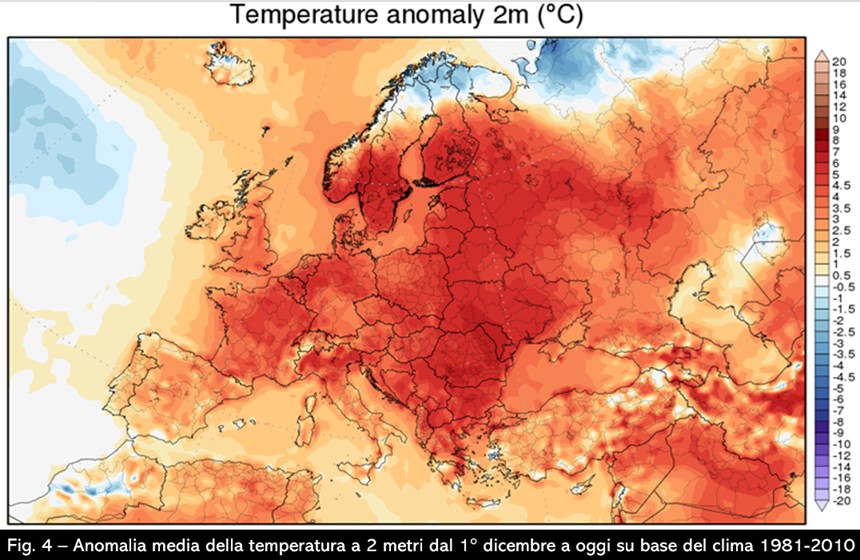 Fin tanto il campo di alta pressione si troverà ad occupare le alte latitudini e questo segnale sarà robusto – come si deduce in chiave probabilistica anche negli ultimi aggiornamenti – la strada ai flussi settentrionali verso le latitudini più meridionali resterà aperta e non svaniranno le possibilità che condizioni più invernali possano arrivare a interessare anche la nostra penisola: come sempre dovremo seguire passo dopo passo gli aggiornamenti restando fedeli ai limiti di predicibilità prima di poter dare indicazioni più affidabili. Lasciatemi comunque almeno sperare che un’irruzione fredda possa raggiungere anche le nostre regioni perché ce ne sarebbe davvero tanto bisogno, dal momento che questo dicembre di inverno non ha avuto proprio nulla e lo stato di anomalia abbondantemente positiva della temperatura a 2 metri dal suolo che abbiamo registrato fino ad oggi su tutto il nostro continente ne è la piena dimostrazione (fig. 4).