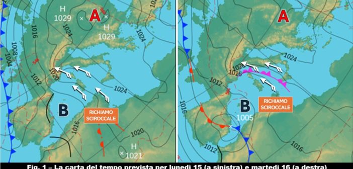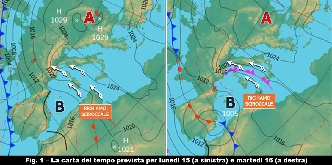 La carta del tempo prevista per lunedì 15 e martedì 16 evidenza molto bene il lento progredire del sistema perturbato che, sotto forma di fronte occluso, sarà destinato a compiere pochi passi in avanti proprio per la resistenza dell’area anticiclonica che andrà comunque a costruire un pendio barico con il Mediterraneo occidentale, dove martedì prenderà forma al suolo un minimo di circa 1005 hPa (fig. 1). L’impostazione sciroccale delle correnti al livello del mare derivante da questa posizione dei due centri di alta e di bassa pressione guiderà così l’aria umida e instabile soprattutto lungo le nostre regioni di ponente e troverà in particolare sulle due Isole Maggiori e sul Nord-Ovest lo sbarramento orografico come valido alleato per esaltare le precipitazioni che potrebbero risultare anche persistenti. Si inizierà dal pomeriggio-sera di lunedì 15, quando i primi fenomeni raggiungeranno la Sardegna, il Ponente Ligure e il basso Piemonte (fig. 2, a sinistra).