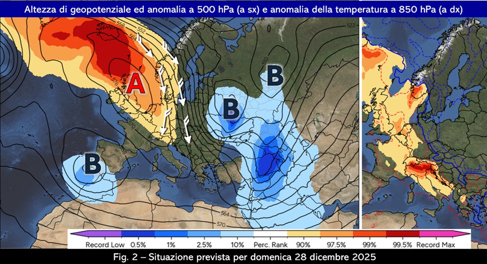 Il fenomeno sarà abbastanza breve perché si attenuerà entro martedì per lasciare il posto ad un primo raffreddamento atteso per gli ultimi giorni dell’anno, di cui parleremo in un prossimo intervento. Prima di continuare con l’analisi della linea di tendenza valida per la prima decade di gennaio e di scendere nei primi dettagli sul possibile avvio di una fase più invernale, desideravo porre alla vostra attenzione questa situazione davvero rara per il tipo di evoluzione: siamo infatti ormai abituati a commentare eventi favonici con aria più calda già in partenza che arriva dalle latitudini subtropicali con l’intervento del promontorio nord africano, ma non da quelle settentrionali con l’intervento di un campo anticiclonico tra la penisola scandinava e le Isole Britanniche.