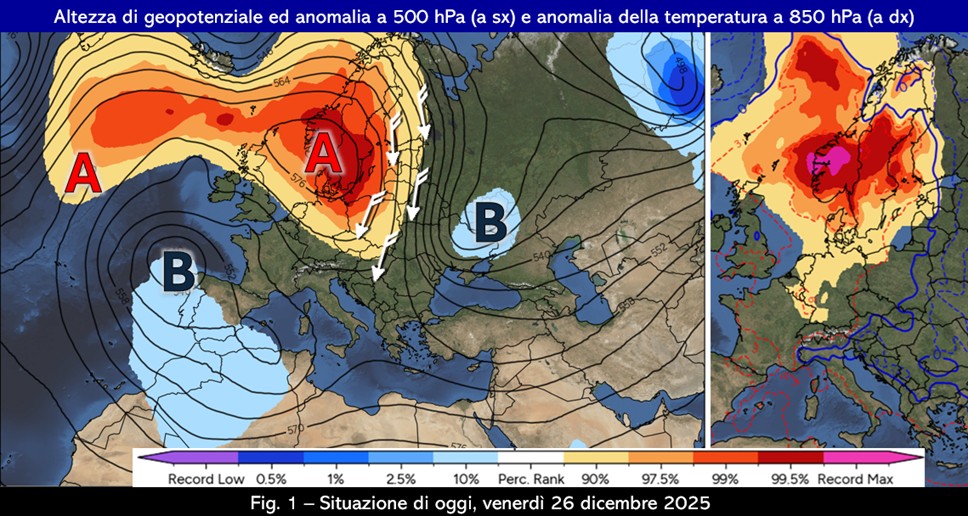 Il campo anticiclonico alle alte latitudini si è ormai stabilizzato in prossimità della penisola scandinava, andando di fatto a bloccare la dinamica atmosferica anche in area mediterranea dove è presente una circolazione depressionaria il cui centro motore principale si è spostato sul Portogallo (fig. 1).