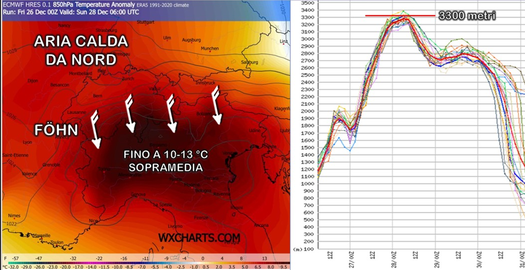Almeno in una prima fase, però, l’aria in arrivo alle nostre latitudini sarà quella che sta attualmente stazionando sulla penisola scandinava, vale a dire una massa d’aria che è calda già in partenza e che, per questioni dinamiche, sarà costretta ad impattare sull’arco alpino per dar luogo a venti di föhn sul versante sottovento: la compressione adiabatica a cui andrà incontro la riscalderà ulteriormente, facendo così superare – sempre per quanto riguarda la temperatura a 850 hPa – quel 99° percentile rispetto alla nostra climatologia di riferimento proprio sull’arco alpino e sulle regioni settentrionali. Soffermandoci su due particolari di questa evoluzione (fig. 3), è curioso far notare come l’episodio favonico coinvolgerà una massa d’aria che a nord dell’arco alpino avrà già una temperatura a circa 1500 metri tra 5 e 8 °C sopra la media e che poi, sul nostro versante, si porterà fino a 10-13 °C sopra la media climatologica di fine dicembre causando di pari passo anche un drastico aumento della quota dello zero termico che supererà i 3000 metri proprio nella giornata di domenica.