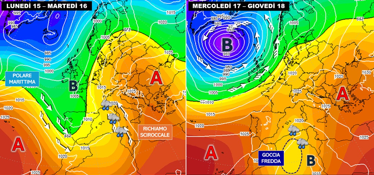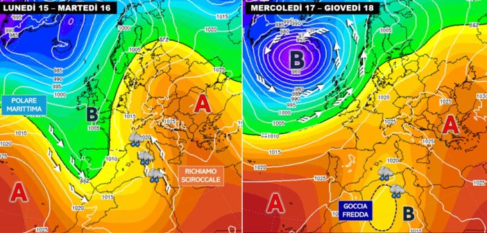 Tra lunedì 15 e martedì 16, l’affondo di una saccatura fin sull’entroterra algerino, alimentata da aria fredda di origine polare marittima, attiverà un richiamo sciroccale sulle nostre regioni di ponente a sostegno di una perturbazione che si troverebbe tuttavia impossibilitata a evolvere verso levante per la presenza dell’attuale figura anticiclonica che andrà a collocare i propri massimi al suolo e in quota tra la penisola balcanica e il Mar Nero. Incalzato anche ad ovest dall’espansione dell’ala orientale dell’anticiclone delle Azzorre, il sistema perturbato subirà così una strozzatura del canale depressionario collegato al flusso principale atlantico e andrà così a chiudersi probabilmente in una goccia fredda tra mercoledì 17 e giovedì 18 proprio sull’entroterra algerino.