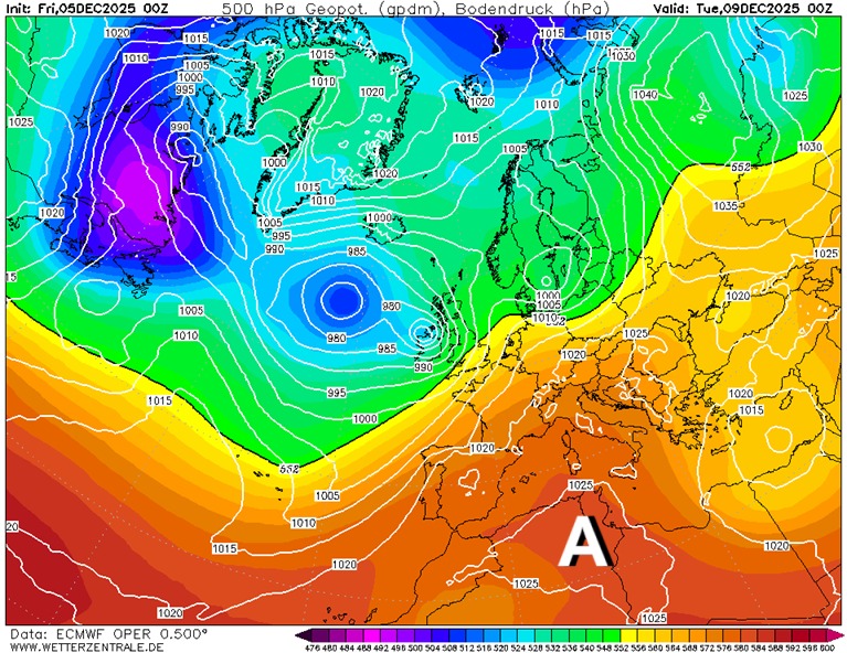 Un breve intervento solo per far notare come cambia, rispetto alla stagione estiva, la struttura della figura anticiclonica nord africana: mentre in estate parliamo solo di promontorio in quota perché al livello del mare abbiamo una bassa pressione termica indotta dall’eccessivo riscaldamento delle aree desertiche, nella stagione fredda la radiazione solare incidente è debole e la figura di alta pressione interessa così tutta la colonna troposferica, fino al livello del mare.