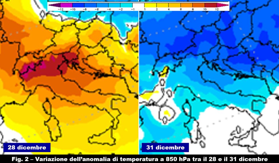 La disposizione dell’asse dell’anticiclone, da nord-ovest verso sud-est, non favorirà un coinvolgimento diretto della nostra penisola che risentirà solo di un parziale rientro delle correnti da est e da nord-est: questa dinamica sarà impostata da una piega delle isobare senza la costruzione di una vera e propria circolazione ciclonica capace di richiamare verso il Mediterraneo centrale la parte più consistente dell’irruzione che resterà confinata al di là dell’Adriatico, dove le isoterme a 850 hPa raggiungeranno valori per lo più compresi tra -7 e -11 °C. Rispetto alle condizioni che vivremo nelle prossime 48-72 ore, caratterizzate come abbiamo visto da un’avvezione di aria relativamente calda proveniente dalla penisola scandinava, si concretizzerà un sensibile calo termico soprattutto in quota perché, partendo da valori di anomalia positiva di 10-13 °C sulle regioni settentrionali e di 4-8 °C sul resto della penisola che registreremo domani (domenica 28), passeremo entro mercoledì 31 a temperature che si porteranno al di sotto della media, fino a 4-6 °C in meno sul Nord-Est e sul medio-alto Adriatico e in genere tra 0 e 4 °C in meno sul resto della penisola (fig. 2).