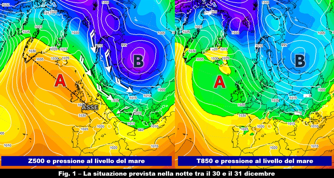 Ricalcolo dopo ricalcolo, la modellistica numerica è riuscita a fornire indicazioni più attendibili e affidabili sulle condizioni atmosferiche che ci accompagneranno verso il nuovo anno. Quel campo anticiclonico che era presente sulla penisola scandinava e che attualmente ha spostato i propri massimi sull’Oceano Atlantico agirà in sinergia con una vasta circolazione depressionaria sulla Russia occidentale e insieme piloteranno aria decisamente fredda verso i settori centro-orientali europei, fino a raggiungere alle nostre latitudini la penisola balcanica (fig. 1).