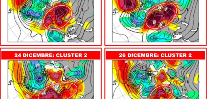 Andando allora ad analizzare la situazione inquadrata intorno al 24-26 dicembre, si vede che nel complesso il segnale dominante emergente dai due cluster prodotti indicherebbe la possibile formazione di un campo anticiclonico alle alte latitudini – indicato in figura da un ovale per agevolarne la lettura – e di un’area depressionaria in prossimità del Mediterraneo centro-occidentale, cioè di una configurazione sinottica che potrebbe essere favorevole a un afflusso di aria più fredda verso latitudini più meridionali rispetto a quelle artiche.