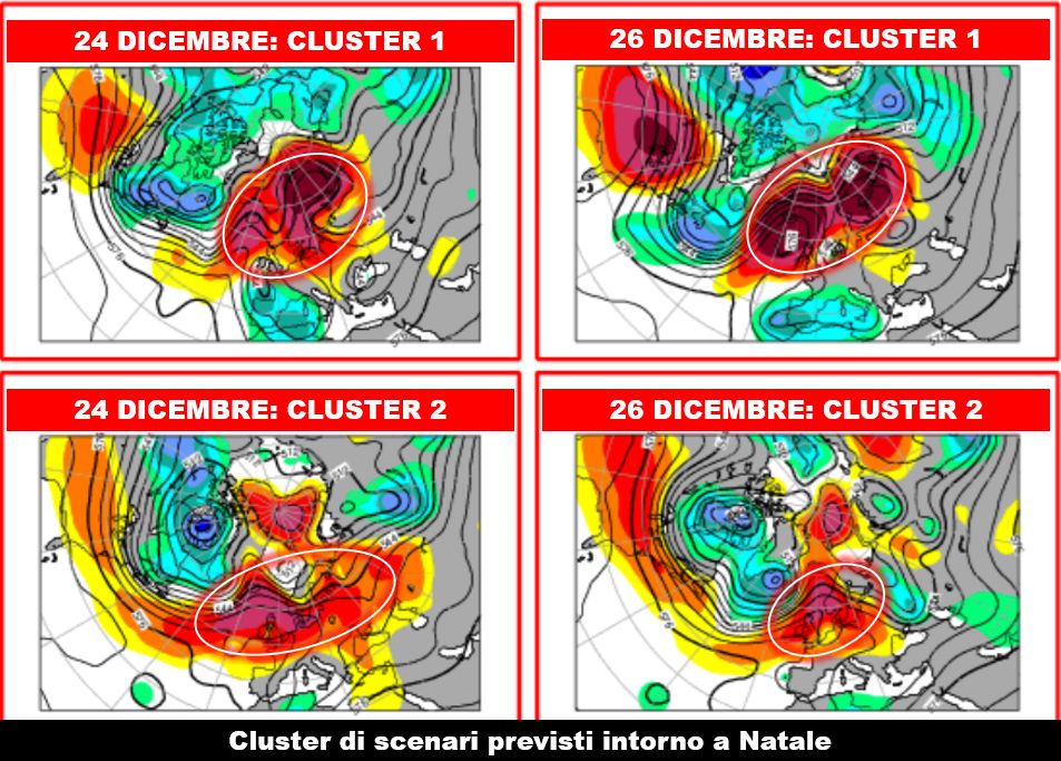 Mancano poco meno di due settimane al Natale e conoscere le condizioni meteorologiche attese per i giorni di festa è uno dei temi più gettonati, come ogni anno. La distanza temporale che ci separa dal 25 dicembre è ancora troppa e, per i motivi ormai ben noti che riguardano l’attendibilità delle previsioni a lungo termine, non è ancora possibile sciogliere la prognosi e definire che tipo di tempo ci aspetta. Dobbiamo allora evitare di trattare l’argomento? Non proprio: possiamo parlarne utilizzando il giusto approccio che, come sempre, è dettato dal metodo di indagine che ci è indicato dalle tecniche messe a punto negli ultimi anni per delineare gli scenari che potrebbero materializzarsi oltre i 7-10 giorni. Si tratta della «cluster analysis», cioè del raggruppamento degli scenari di ensemble prodotti in chiave probabilistica secondo schemi sinottici che risultano simili tra di loro, considerando tutta la cinquantina di scenari calcolati.