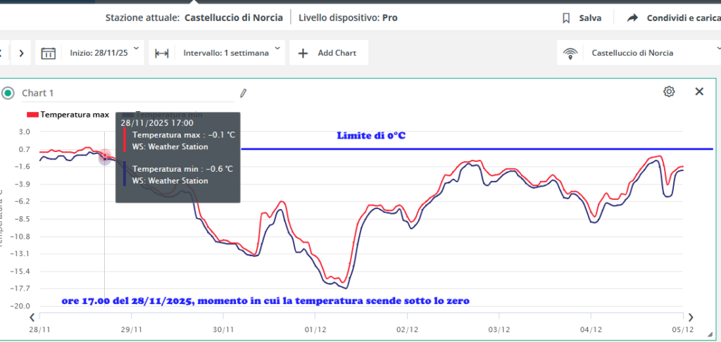 Ma andiamo ad analizzare la settimana di ghiaccio di cui parliamo nel titolo dell’articolo: infatti, come mostrano i grafici della stazione meteo, la temperatura ha iniziato ad entrare in territorio negativo alle 17 00 del 28 novembre 2025, con condizioni di innevamento al suolo.