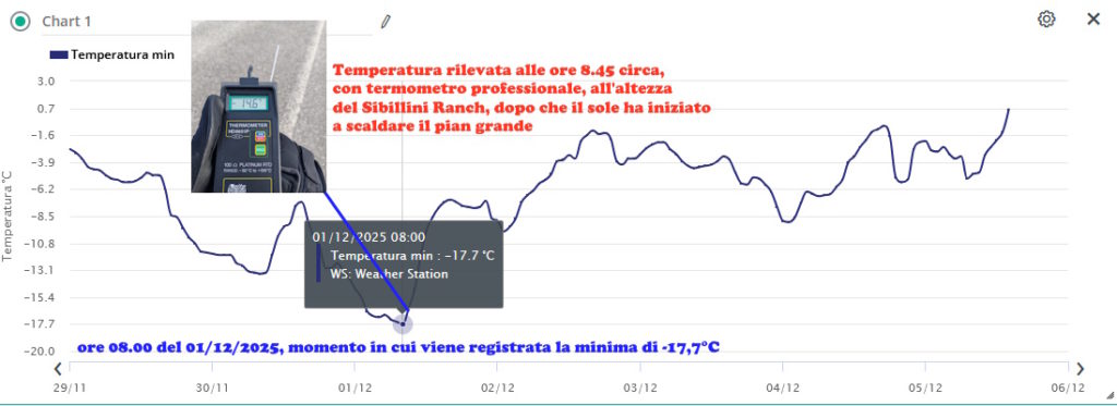 Poi, sono stati raggiunti valori minimi e massimi continuamente sotto lo zero, con minima di -17,7°C registrata alle ore 08.00 dell’1 dicembre, cosa confermata da un nostro lettore che si trovava nei pressi della stazione meteo, intorno alle 8,45 che ha rilevato -14,6°C dopo che era uscito il sole sul Pian Grande