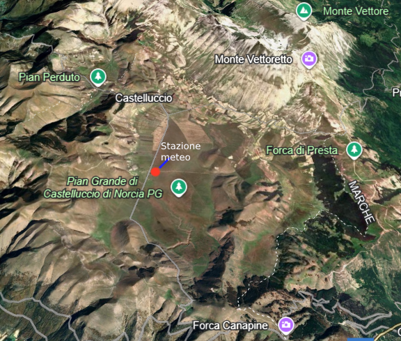 Da quest’anno, la nostra associzione, Perugia Meteo, insieme a quella di Caput Frigoris, hanno spostato una stazione meteorologica direttamente sul pian grande, precisamente a metà della caratteristica strada rettilinea che solca il piano, all’altezza del Sibillini Ranch, iniziando un monitoraggio che, forse, non è era mai stato fatto, con frequenza oraria, in questa zona, ma solo occasionalmente, il più delle volte con il termometro delle automobili in transito o con termometri, anche di precisione, degli appassionati