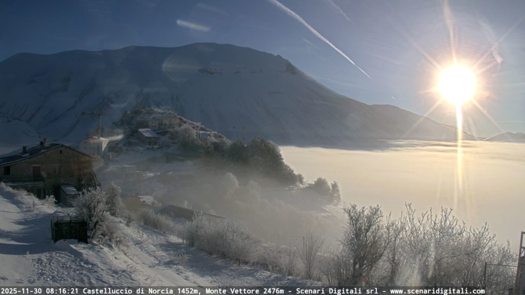 Questa particolare conformazione geomorfologica, favorisce il fenomeno dell’inversione termica che, tipicamente in inverno ma non solo, in condizioni di alta pressione e cieli sereni, dove il raffreddamento del suolo per irraggiamento intrappola l’aria fredda a bassa quota, crea uno “strato-tappo” che impedisce il rimescolamento verticale, mantenendo temperature più basse in pianura rispetto alle montagne circostanti. Questo, sull’altopiano di Castelluccio, per chi c’è stato, in qualsiasi stagione, in presenza soprattutto di cielo sereno o di nebbia al piano, comporta differenze di temperature vistose, a volte davvero pazzesche tra l’abitato del paese di Castelluccio e i piani circostanti