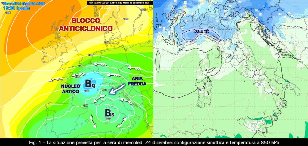 Nelle ultime ore si è andato completando l’isolamento di una circolazione depressionaria sui mari occidentali dell’Italia e l’affermazione di un vasto e robusto campo anticiclonico esteso dall’Oceano Atlantico alla penisola scandinava. La configurazione sinottica ha cambiato così le proprie caratteristiche e si avvia a mantenere per qualche giorno lo stesso tipo di tempo nelle aree interessate da queste rispettive figure bariche che rallenteranno di molto la propria evoluzione trovandosi sostanzialmente bloccate (fig. 1, a sinistra). In questo disegno andrà inoltre inserendosi il moto retrogrado di un nucleo di aria artica che nelle prossime 48 ore scivolerà lungo il fianco orientale dell’alta pressione scandinava per dirigersi verso la Francia entro la sera di domani, mercoledì 24 dicembre.