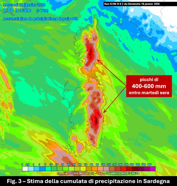 Se da un lato questa espansione favorirà l’arrivo da est di correnti più fredde – destinate a interessare soprattutto il Nord e il versante adriatico – dall’altro lo schiacciamento che subirà la depressione ad opera di questo blocco anticiclonico incrementerà sensibilmente il gradiente barico sull’area ionica e su quella tirrenica meridionale e quindi la pendenza dello scivolo virtuale su cui si muoverà la massa d’aria che giungerà sulle nostre regioni meridionali e in Sardegna sotto forma di venti basculanti tra scirocco e levante. L’intensa ventilazione dai quadranti sud-orientali, che soffierà con velocità medie tra burrasca e burrasca forte (65-85 km/h) e raffiche tra tempesta e fortunale (85-120 km/h) anche se non sono esclusi picchi superiori specie allo sbocco delle valli per il noto «effetto Venturi», trasporterà una quantità di vapore acqueo ben superiore a quella consona al periodo tanto che, anche nelle ultime elaborazioni della modellistica numerica, si ritiene che il flusso umido in arrivo possa avere caratteristiche di eccezionalità per questo periodo dell’anno. Lo sbarramento che le correnti troveranno andando a impattare sui versanti orientali dei rilievi della Sardegna, della Sicilia e della Calabria incentiverà la rapida condensazione del contenuto di vapore e la formazione di forti precipitazioni che, entro martedì sera, cadranno anche a carattere di violento nubifragio raggiungendo probabilmente cumulate di 100-150 millimetri su vaste aree costiere e ad esse prossime, in rapido incremento procedendo verso i settori montuosi dove sui versanti esposti non è escluso il raggiungimento di picchi compresi tra i 400 e i 600 millimetri (figg. 2 e 3).