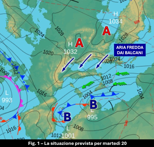 Siamo alla vigilia di un serio peggioramento dello stato del tempo che impegnerà da questa sera a mercoledì le regioni meridionali e la Sardegna. È questo uno dei casi in cui l’utilizzo di termini e di aggettivi che possono sembrare sensazionalistici o roboanti si addice invece alla descrizione dell’evento perché l’evoluzione della dinamica meteorologica attesa si accompagnerà ad un ampio ventaglio di fenomeni di forte o di eccezionale intensità: si raccomanda quindi di non prendere assolutamente sottogamba gli avvisi che saranno diramati dalla Protezione Civile che è già nello stato di preallerta. Come detto nelle analisi precedenti, questa fase di grave maltempo sarà legata al lento passaggio di un’insidiosa depressione afro-mediterranea che si troverà bloccata nel proprio spostamento verso levante da una robusta figura di alta pressione che dalla Russia si è allungata fino alla penisola balcanica (fig. 1).
