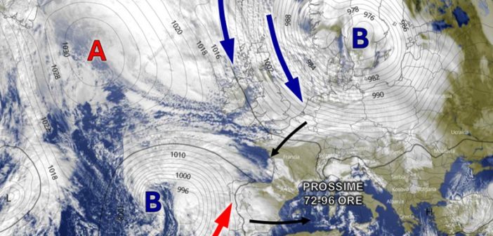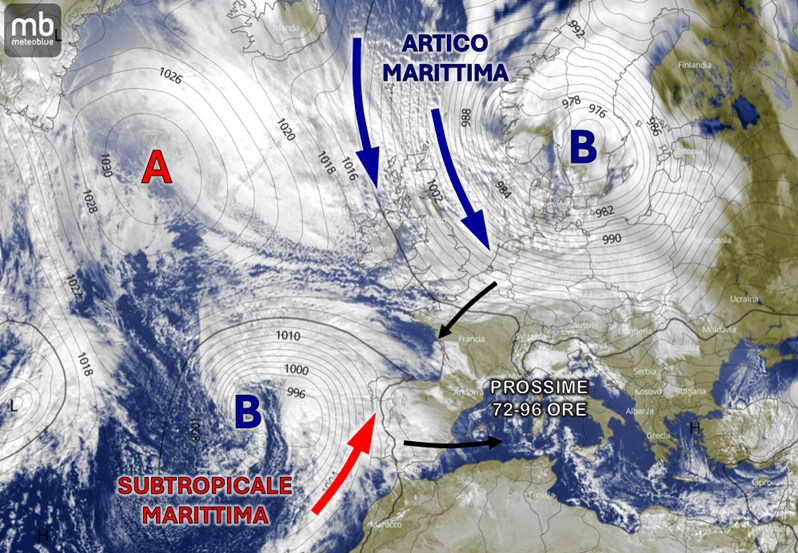 L’immagine satellitare di questo pomeriggio ci mostra la posizione delle figure bariche che saranno responsabili delle condizioni meteorologiche attese sul Mediterraneo nei prossimi 6-7 giorni. Due diverse circolazioni cicloniche, una fredda di origine artica e una più temperata di matrice oceanica, si daranno appuntamento proprio alle nostre latitudini e, interagendo, andranno a costruire le condizioni atmosferiche che osserveremo sulla nostra penisola tra il 4 e il 7 gennaio.