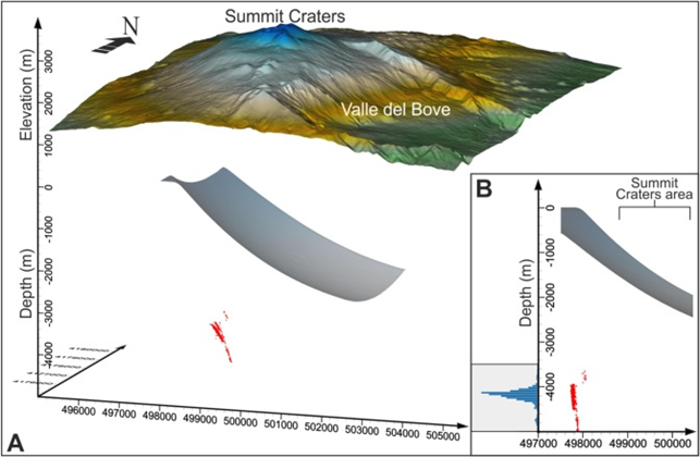 La figura mostra, in 3D, le zone in cui si trovavano le sorgenti di massa e pressione sotto la sommità del Monte Etna tra ottobre e dicembre 2018. I punti rossi rappresentano le soluzioni delle inversioni Monte Carlo dei dati di deformazione, mentre la superficie grigia indica l’area in cui le sorgenti di massa dovevano trovarsi per spiegare le variazioni di gravità osservate. La sezione est-ovest evidenzia anche la distribuzione di probabilità relativa alla profondità della sorgente di pressione.