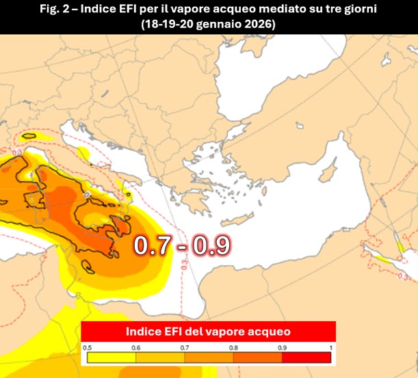 Una fenomenologia, fatta principalmente di precipitazioni sotto forma di pioggia, che potrebbe risultare ancora una volta particolarmente abbondante perché si svilupperà a carico di un’intensa avvezione di vapore acqueo, di cui l’Extreme Forecast Index lascia intendere il raggiungimento di valori davvero inusuali per il periodo – compresi tra 0.7 e 0.9 su una scala che arriva all’unità – tra il 18 e il 20 gennaio (fig. 2). In altre parole, ci troveremo dinnanzi a un peggioramento di stampo prettamente autunnale che andrà a concentrare le cumulate più abbondanti laddove il flusso prevalentemente sciroccale sarà costretto al sollevamento forzato dall’orografia delle due Isole Maggiori e dell’Appennino meridionale, tra l’Aspromonte e la Sila. È ovviamente ancora presto per scendere nei dettagli su quanto potrebbe piovere, ma ci sono ad oggi i presupposti per pensare che si apra, per queste aree appena menzionate, una fase molto piovosa.