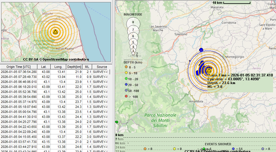 SERIE DI SCOSSE DI TERREMOTO IN ATTO NELLA ZONA DI S.ANGELO IN PONTANO (MC)NELLE MARCHE. GLI EVENTI PIU’ FORTI DI Ml 3.8, Ml 3.1 e Ml 3.0